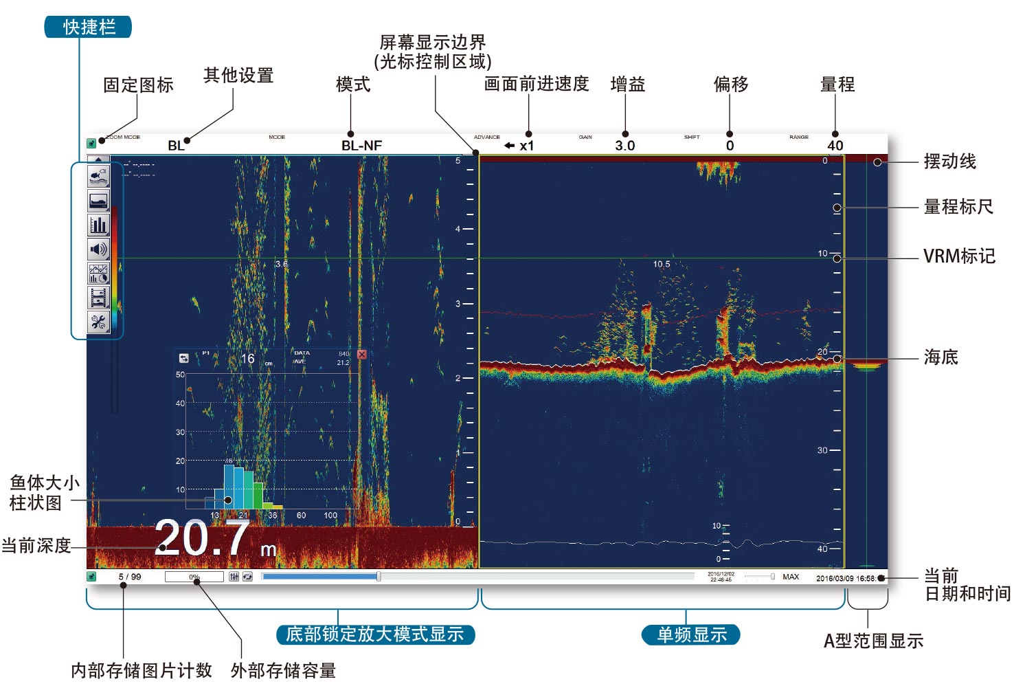 最多可在同一屏幕上显示3个不同频率回波。一眼即知每种鱼的类型。