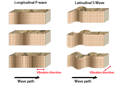 Seismic waves can be roughly classified into three types: longitudinal P-waves that have a compressional structure similar to sound waves, torsional latitudinal S-waves, and surface-travelling waves. An earthquake begins with small shaking and rattling, and continues into larger trembling. The first minor shaking is caused by P-waves, and large tremors are the result of S-wave activity.