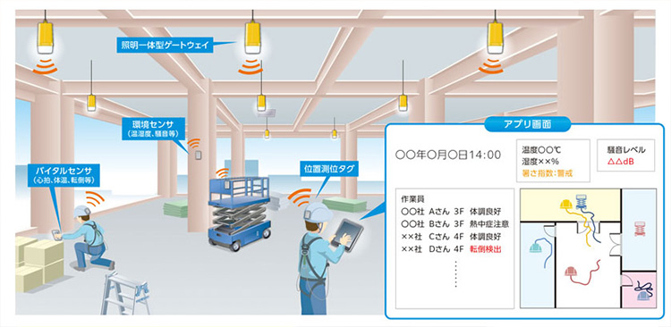 宮崎:はい、「照明一体型ゲートウェイ」を開発中です。センサーを内蔵した照明器具で現場の情報を収集し、解析して人や物の位置やスマートウォッチの装着者のバイタル(脈拍)などをアプリで可視化し、現場管理を一元化したり、遠隔化したりするためのシステムです。