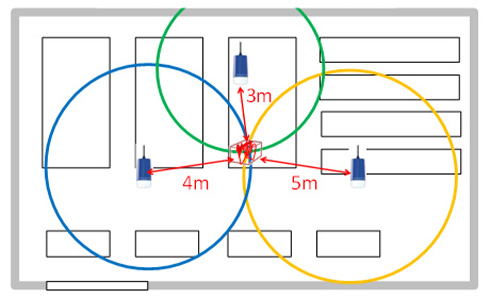 宮崎:Bluetooth規格の一種であるBLE(Bluetooth Low Energy: Bluetoothの一部。低消費電力通信モード)(※2)を用いた三点測位です。三点測位とは、BLE対応センサーから発信される電波を3つ以上のゲートウェイで受信し、その受信電波強度から距離を計算し、平面上での1点を測位する手法です。原理としては、GPSに共通しています。GPSは複数の衛星から発信される信号を受信した時刻をもとに、正確な位置を割り出しています。