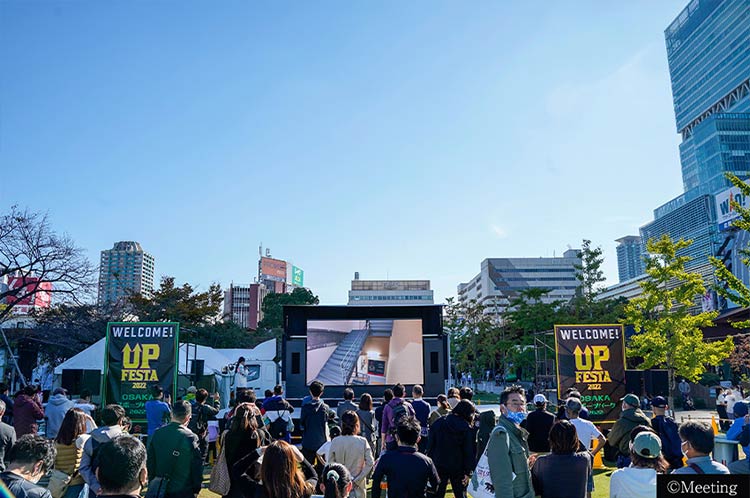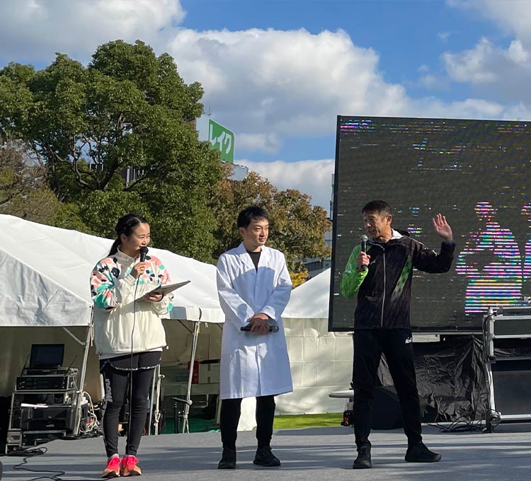 パブリックビューイングのステージの様子(左から山口氏、宮崎氏、森脇氏)