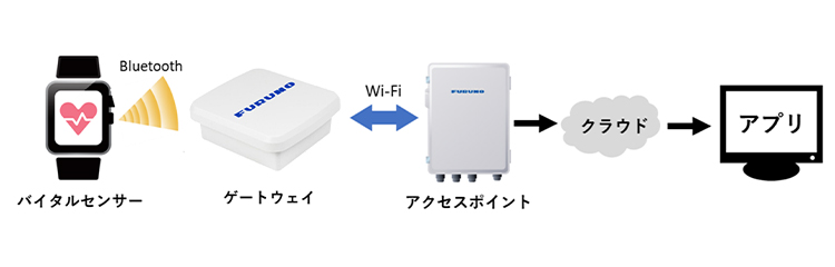 システム構成としては、アスリートが取り付けたバイタルセンサーが取得したデータをBluetooth経由でゲートウェイが収集し、そのデータをWi-Fi経由でクラウドにアップロードします。