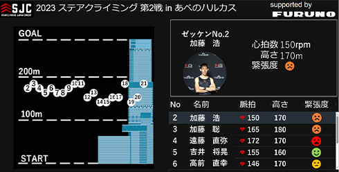 各選手のゼッケン番号のラベルが、スタート地点からゴールを目指して動いていき、そして、高さのほか、選手の脈拍と緊張度もリアルタイムに表示されました。