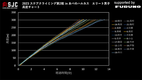さらに大会終了後に得られた選手データを分析してみると、あることが分かりました。トップを競う選手ほど、高度チャートが直線を描いており、ペースダウンが見られませんでした。