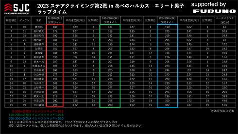 緒方 航選手は20 階(高度約100m)まで区間6位で通過するものの、自分のペースを守り切ったことで、平均ラップタイムの誤差(ペースバラツキ)がわずか1.7 秒というペース配分で優勝しました。一方、2位となった高村 純太選手は、先行逃げ切りで攻めたものの、後半にペースダウンし、平均ラップタイムの誤差が20.3秒と大きくなり遅れました。