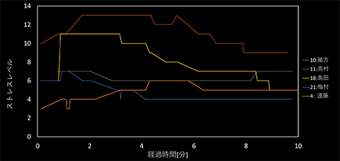 また、各選手のストレス度をバイタルセンサーから読み取り、パブリックビューイングのステージで公開しました。ストレスレベルは「0~5」の範囲であれば正常、「6~12」は要注意で、それ以上は非常に高いストレス度を示します。ストレスレベルが10を上回る選手は少ない中、緒方 航選手は、スタートから7分あたりまで10 から13 と高いレベルで推移しており、高いストレス度の中、安定したラップタイムを維持していたことが分かりました。