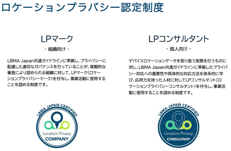 また、ロケーションプライバシー認定制度を設け、組織向けには「LPマーク」、個人向けには「LPコンサルタント」を認定しています。ガイドラインに準拠し、プライバシーに配慮した適切なガバナンスを行っている個人や組織を認定する制度です。