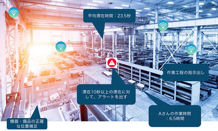 GPSを含む広域分析との組み合わせによって、現場内のデータのみでなく、以下のような近隣広域での人流・物流データの可視化が可能です。それにより、たとえば滞在10秒以上の人に対してアラートを出し作業工程の指示を出すなどが実施できます。