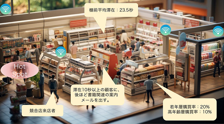 例として、POSデータとの組み合わせによって、顧客の購買行動を可視化することで、最適な施策を打ち出すための指標化や、リテールマーケティングにも展開できます。リテールマーケティングとは、商品の仕入れや物流、販売などを効果的に行う手法です。