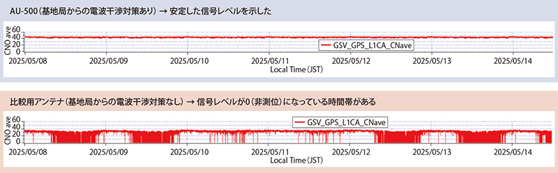 実験では、2台のAU-500で干渉対策の有無による信号の受信レベルを比較した。その結果、対策なしのアンテナは平日日中に非測位となるケースが頻発したのに対し、対策ありではAU-500は常に安定した信号レベルを維持した。