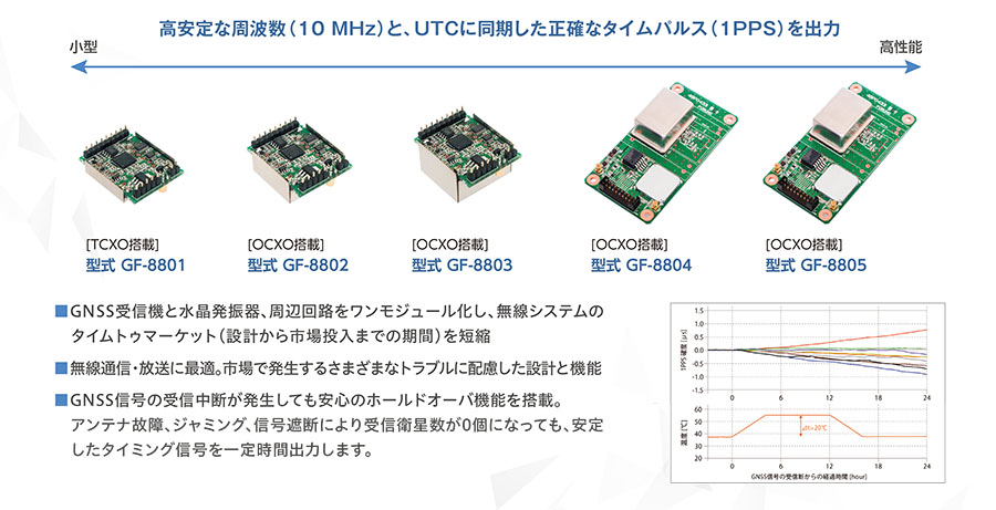 L1/L5帯に対応し、UTCに 同期した1PPSと任意のクロックを出力。
