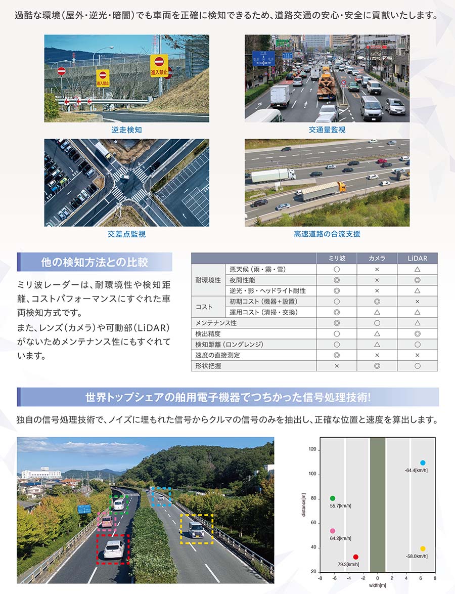 当社は、耐環境性・長距離検知・コストパフォーマンスに優れた 車両検知用ミリ波レーダーをご紹介。交通量監視や交差点監視、逆走検知など多様なニーズに対応し、道路交通分野に新たな価値を提案しました。