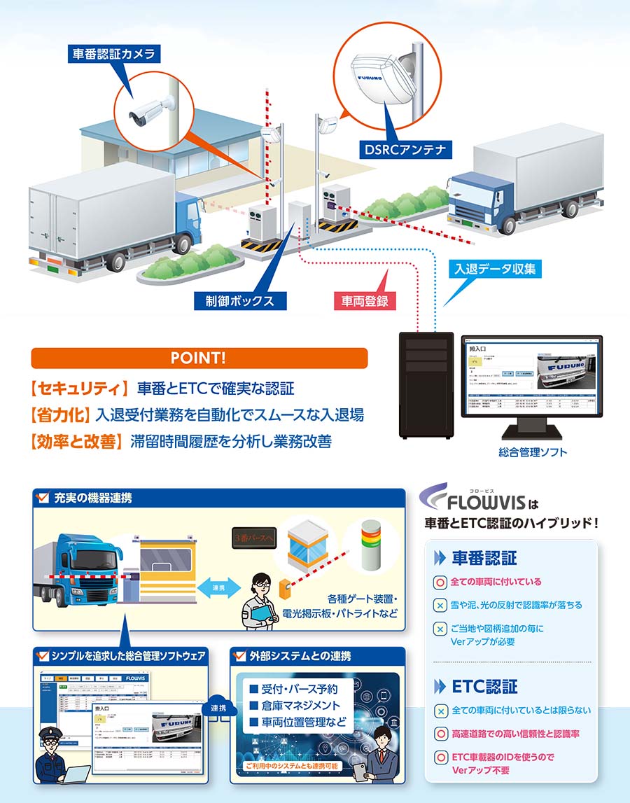 FLOWVISでは車番とETC認証により、車両を「確実に」識別して自動でゲートを開閉します。 入退場履歴も自動で記録。受付の省人・省力化やスムーズな入退場管理を実現します。複数の入退場口の一元管理や、ゲート以外の各種機器制御にも対応しています。
