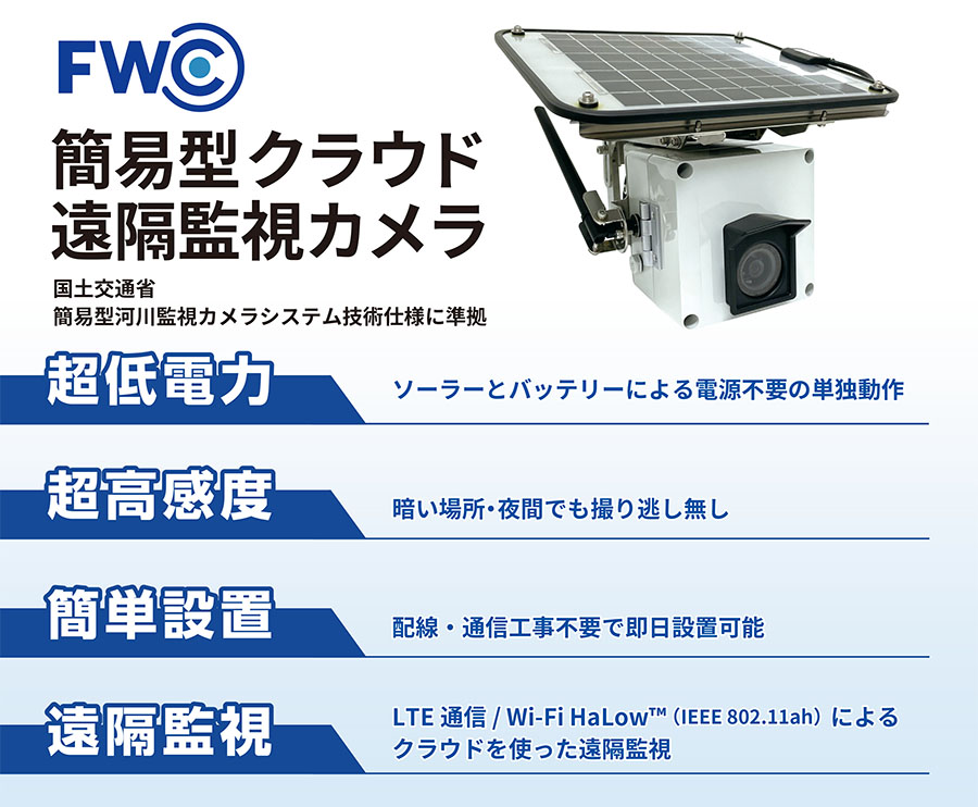 夜間や暗い場所でもフラッシュ無しで撮影可能なソーラー&バッテリ一体型の簡易型クラウド遠隔監視カメラです。ソーラー給電で動作する超低電力、フラッシュ無しで夜間撮影可能な超高感度、電源・通信工事不要でその日から使える簡単設置が特長で、ネットワークはLTE/Wi-Fi HaLow™(IEEE802.11ah)を使用しており、クラウドを使用した遠隔監視が可能です。