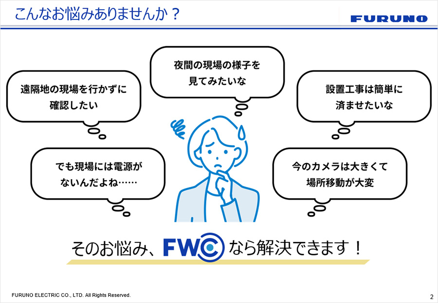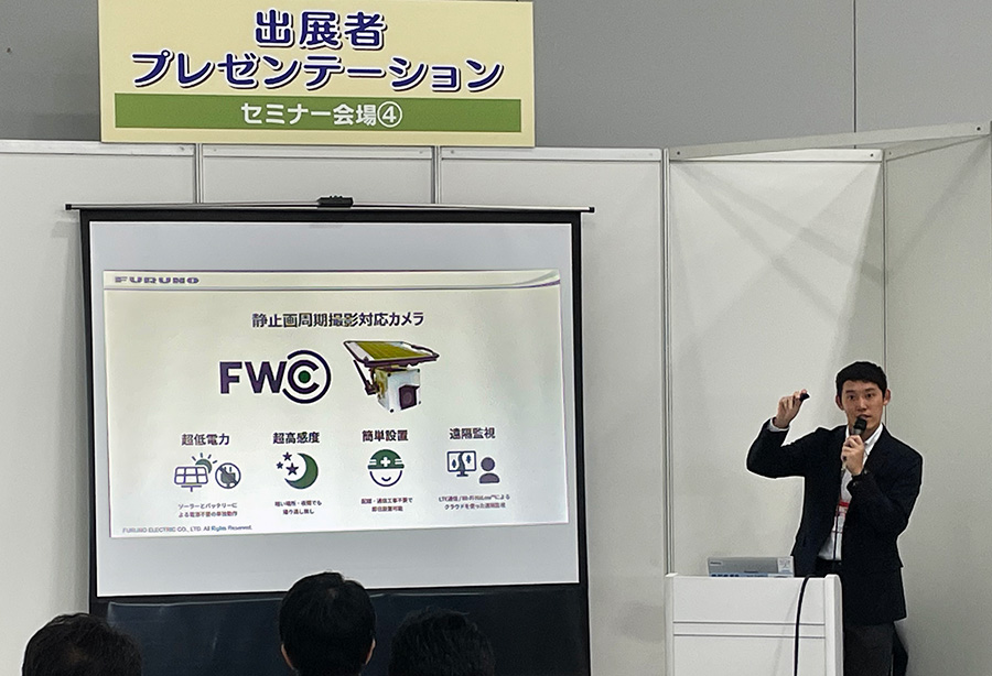 当社は、夜間や暗い場所でもフラッシュ無しで撮影可能なソーラー&バッテリ一体型の簡易型クラウド遠隔監視カメラ「FWC」を出展しました。