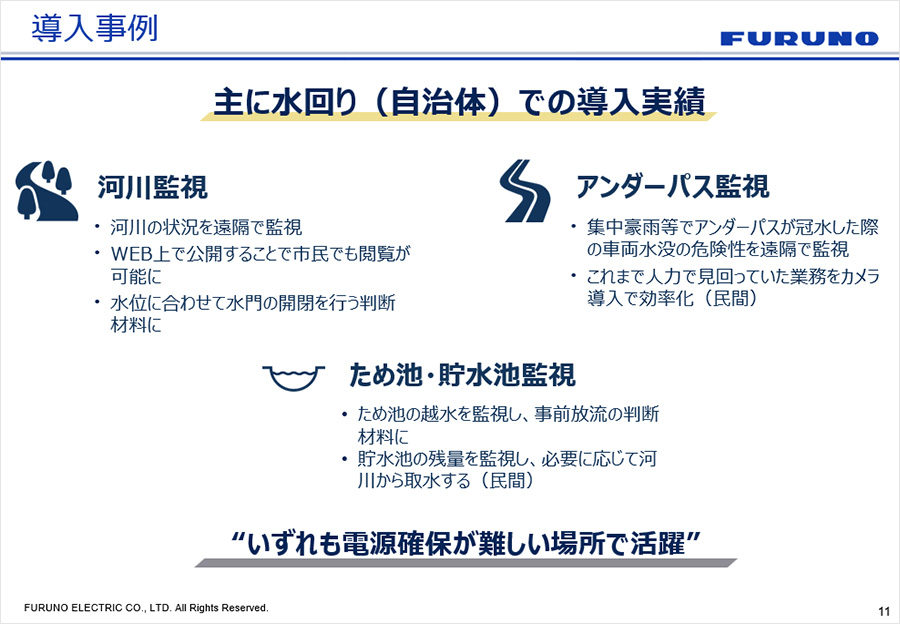 ソーラー給電で動作する超低電力、フラッシュ無しで夜間撮影可能な超高感度、電源・通信工事不要でその日から使える簡単設置が特長のワイヤレスカメラです。ネットワークはLTE/Wi-Fi HaLow™(IEEE802.11ah)を使用しており、クラウドを使用した遠隔監視が可能です。