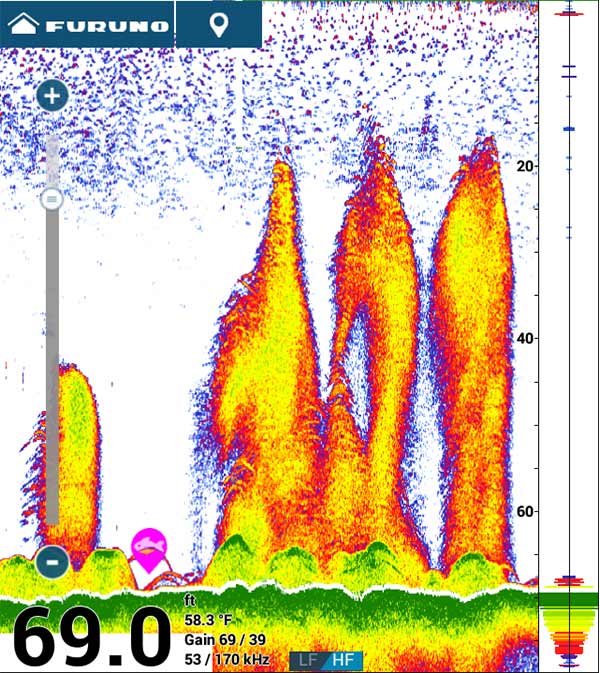 魚探反応レベルに応じて自動でゲインを調整し、最適な映像を表示します。また従来よりも深くまでCHIRP送信することで、深場でも高分解能の映像を表示します。