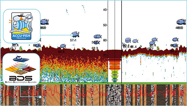 受信したエコーが単体魚だった場合にサイズを計測し、画面上に数値やマークで表示します。また水深5~100 mの間の海底質を岩・小石・砂泥の4種類の底質タイプに分類し、画面上に海底の状態をわかりやすく表示します。