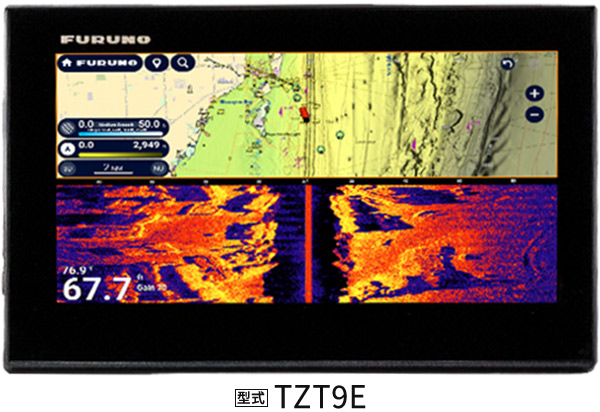 スキャニングソナーCSH-10はTZtouchEシリーズとの接続により、TZtouchEシリーズの画面上でエコー表示、チャート重畳、操作、設定が可能となりました。タッチパネルの利点を活かし、ティルトインジケータや感度等をタッチ操作できるなど、直感的な操作が可能です。さらにチャート画面にスキャニングソナーのエコー映像をリアルタイムで重ね、操作することができ、TZ BathyVisionの等深線に重畳することで、海底地形と魚群の把握に大きく貢献します。漁船市場で磨き上げられた妥協のない実力を持ち合わせたスキャニングソナーと、最新のマルチファンクションディスプレイとの連携で、フルノはソナーの可能性に挑み続けます。