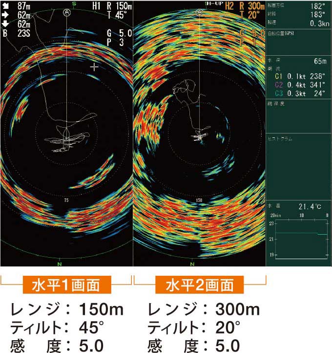 半周型ソナーの探知方法である水平方向180°の断面探知が可能。また、半周型ソナーの探知映像と全周型ソナーの探知映像を1つの画面上、または、デュアルディスプレイにそれぞれ表示でき、大画面で同時に確認できます。