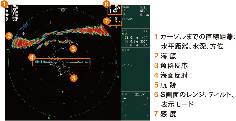 魚群反応にターゲットロックマークを打つことで、その魚群までの距離や水深、魚群の移動方位や速度を数値で表示します。