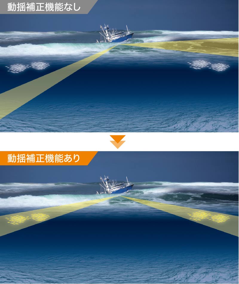 好評な従来機採用の垂直2方位併記(このクラスのソナーでは世界初)を継承。任意方向の垂直断面探知(0~90°)を1方位、または、2方位併記できます。垂直2方位併記では、同時に2つの魚群比較も可能です。