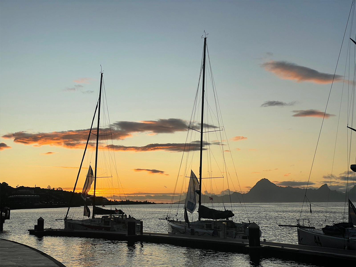 夕焼けとMILAI号(船)。ニュージーランドでしっかり整備できたので、ここでは大規模な整備はせず、ゆっくりできました。久しぶりの休息です。後ろの山は対岸に浮かぶモーレア島です。