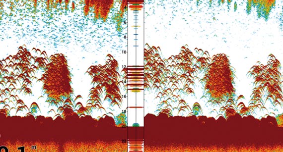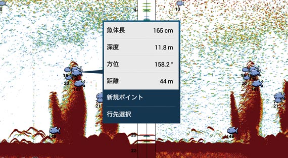 魚の反応をフィッシュマークで表示するこの機能なら、魚礁とその付近にいる魚との判別に大変有効です。魚礁などのストラクチャー付近でのフィッシングに最適な機能です。