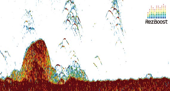 RezBoost™は、従来の送受波器をそのまま利用して、より鮮明で高精細な画像表示を実現するフルノ独自の信号処理技術です。判別しづらい底付きや瀬付き魚群を明確に分離して表示します。