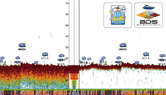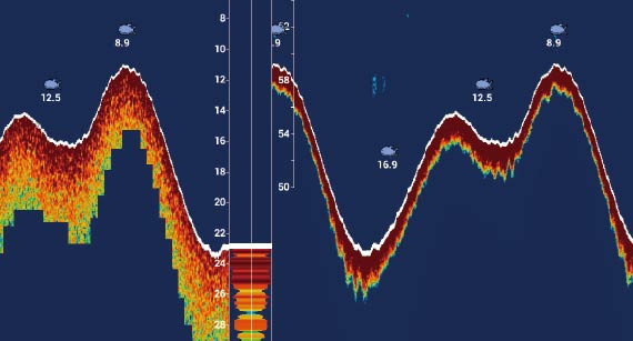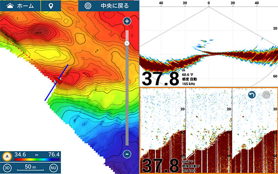 使い慣れた魚探画面で左右の魚群、海底地形を把握することができます。