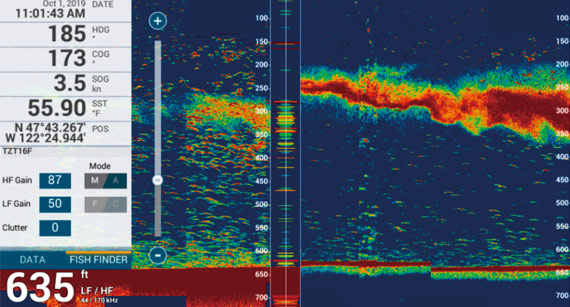 NavNet TZtouch3では、深場の魚群や、瀬付、海底魚群を詳細に探知する1 kWのチャープ魚探を内蔵しています。海底約200メートルの海底付近にいる魚探も分離して表示します。
