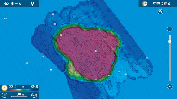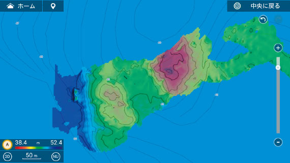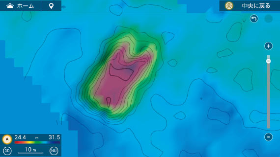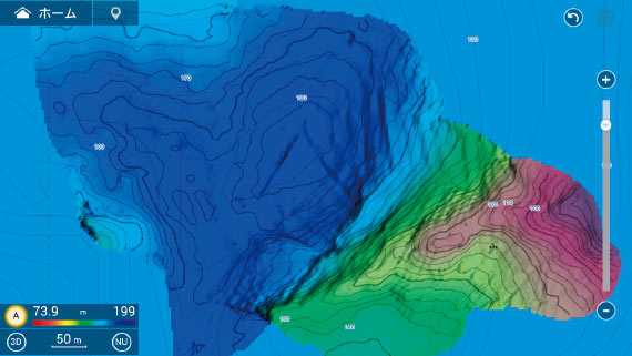 NavNet TZtouch3(Ver.2.01以降)では、高精細な海底マップを効率的に作成し、等深線とともに色別表示できる海底マッピング機能を実現しています。